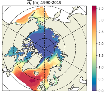 Average significant wave height (š»ā) for the period 1990–2019, showing the spatial distribution of mean wave energy across the North Atlantic and Arctic Oceans. Elevated š»ā values are evident in high-latitude regions influenced by strong winds and reduced sea-ice cover, highlighting the persistently harsh sea states surrounding Greenland that constrain long-term maritime and naval operations (Casas-prat et al., 2023)